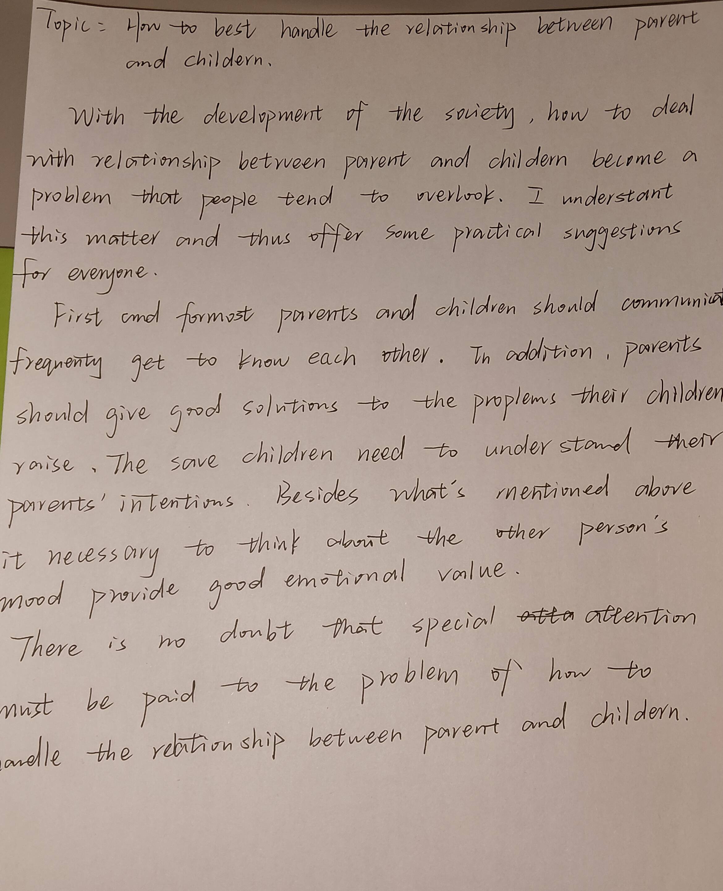 With the developmont of the soviety, how to deal with relationship between parent and chi den become a problem that people tend to overlook. I understand this matter and thus offer Some practical suggestions for evenyone.