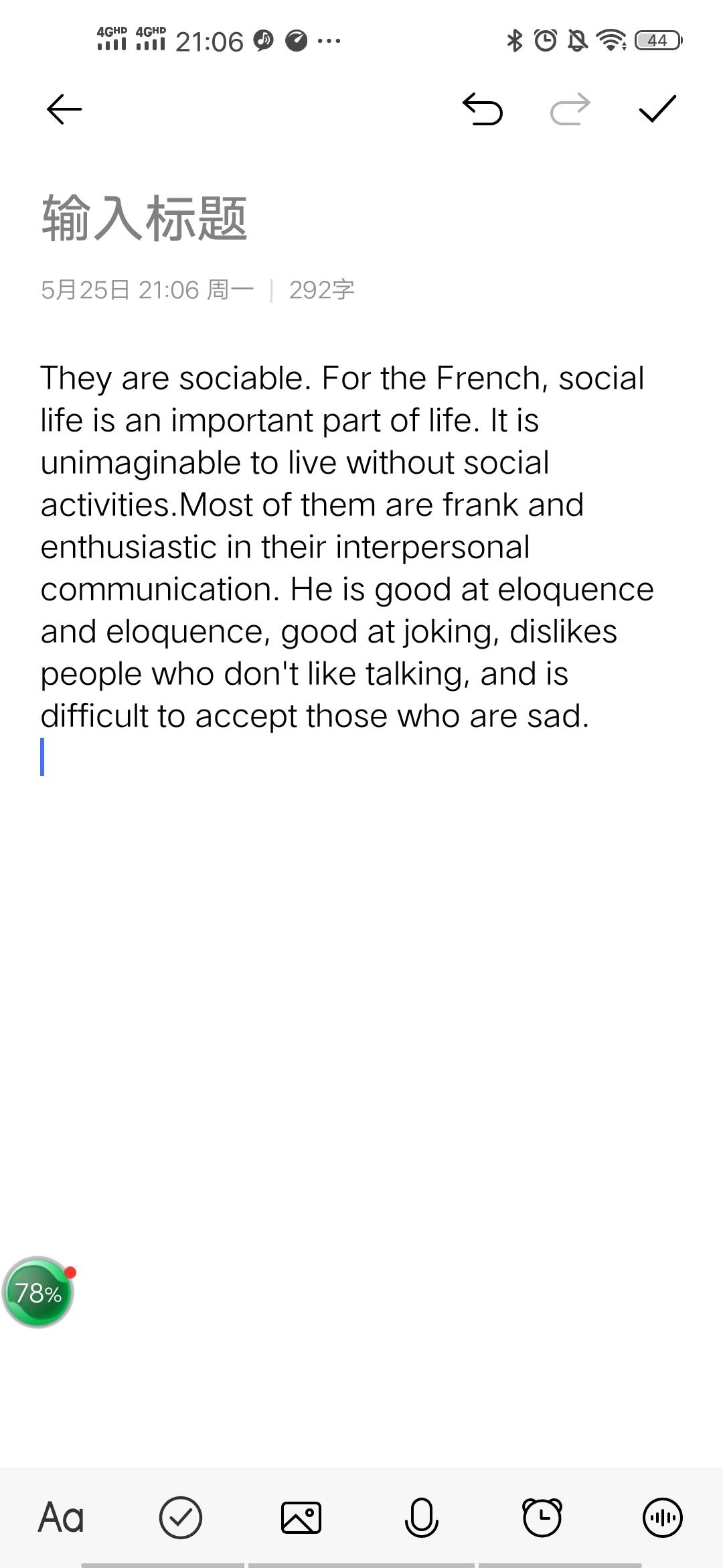 1.Sociable:Social activity is an important part of French people's daily life. For them, living without social activities in unbelievable. Frenchmen tend to be hearty and enthusiastic in communication. They like to joke. They dislike people who talk less and hate people who always frown.