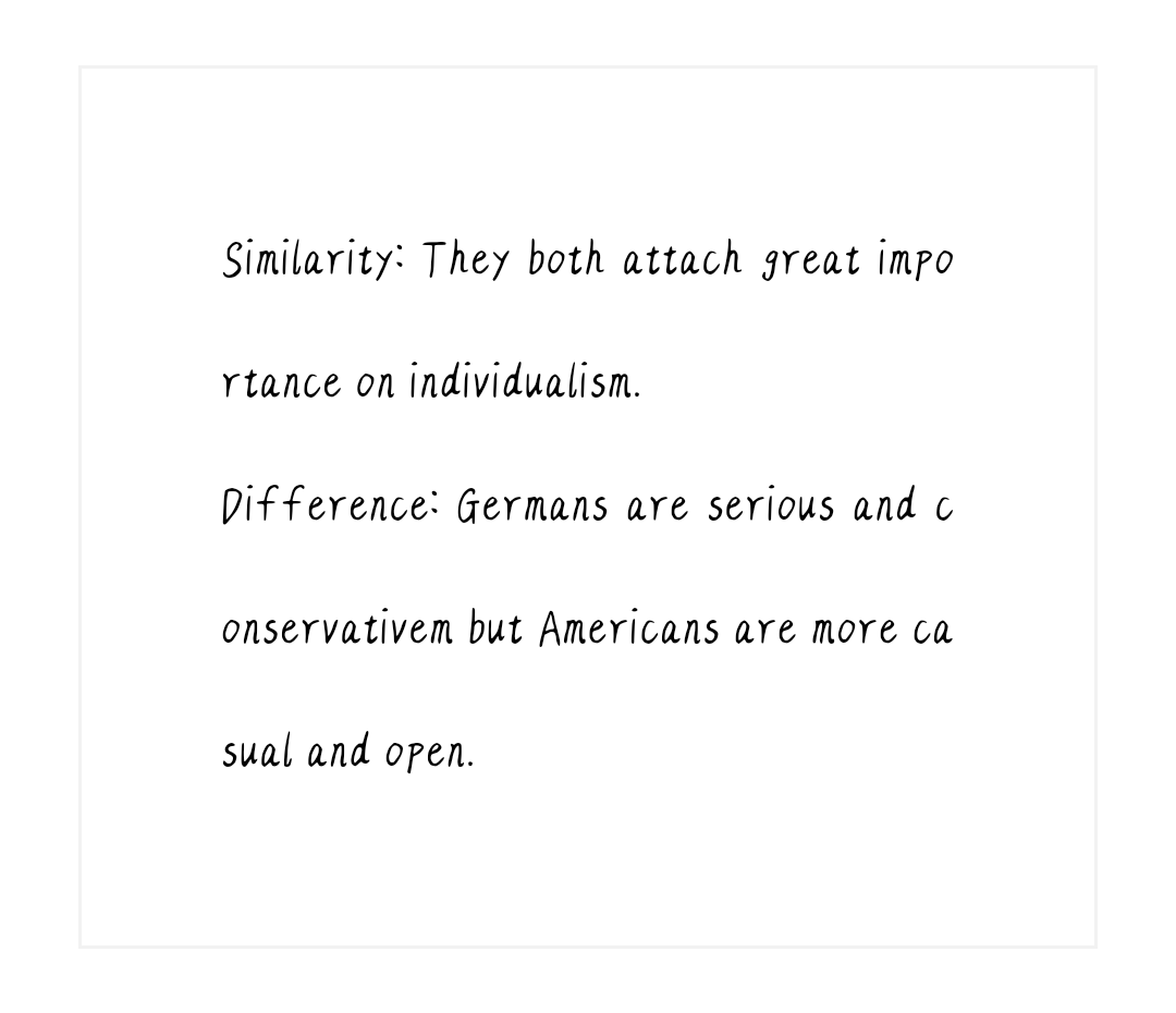 Differences:Americans emphsize freedom and hate the feeling of being trapped,while Germans tend to be more serious and traditional.