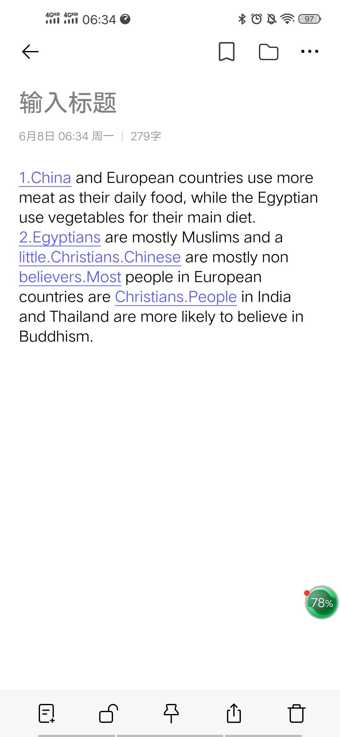 1.China and European countries use more meat as their daily food, while the Egyptian use vegetables for their main diet.