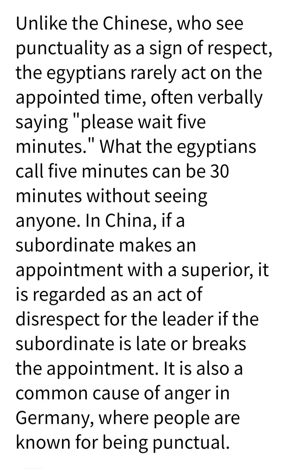Unlike the Chinese, who see punctuality as a sign of respect, the egyptians rarely act on the appointed time, often verbally saying "please wait five minutes." What the egyptians call five minutes can be 30 minutes without seeing anyone. In China, if a subordinate makes an appointment with a superior, it is regarded as an act of disrespect for the leader if the subordinate is late or breaks the appointment. It is also a common cause of anger in Germany, where people are known for being punctual.