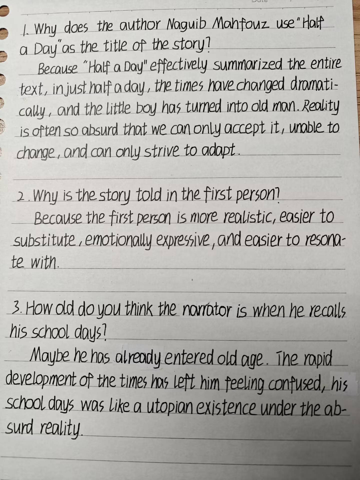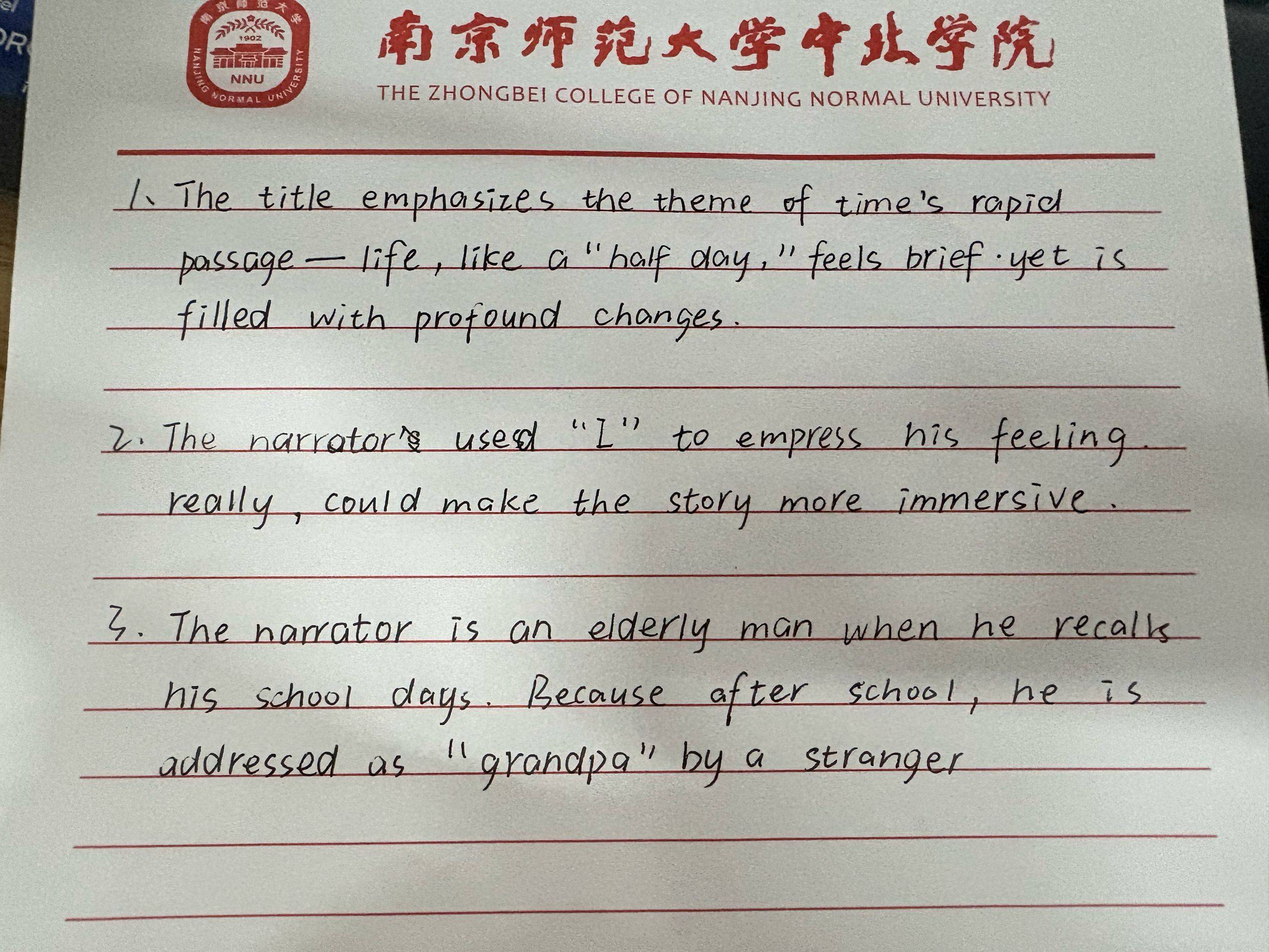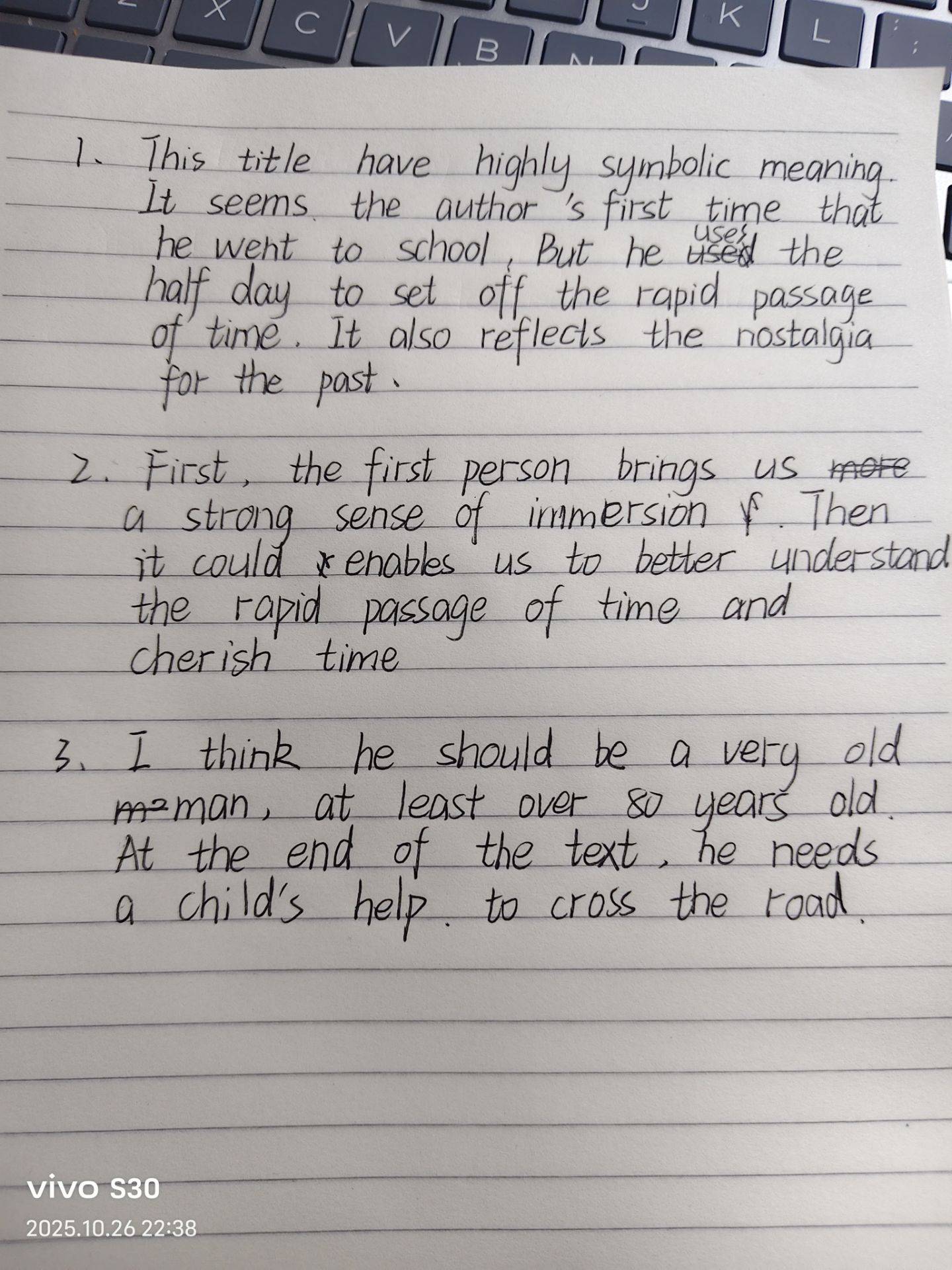 3. I think the narrator is an old man when he is recalling. At the end, it is written that he stands at the school gate, finding that the familiar way home has vanished, surrounded by "racing cars", "skyscrapers" and "noise". He feels confused and needs to "wait for a long time" to cross the road. This depicts an image of an old man who is out of touch with society and moves slowly. He uses the review of his "half-day" experience at school to metaphorically summarize his fleeting yet long life.