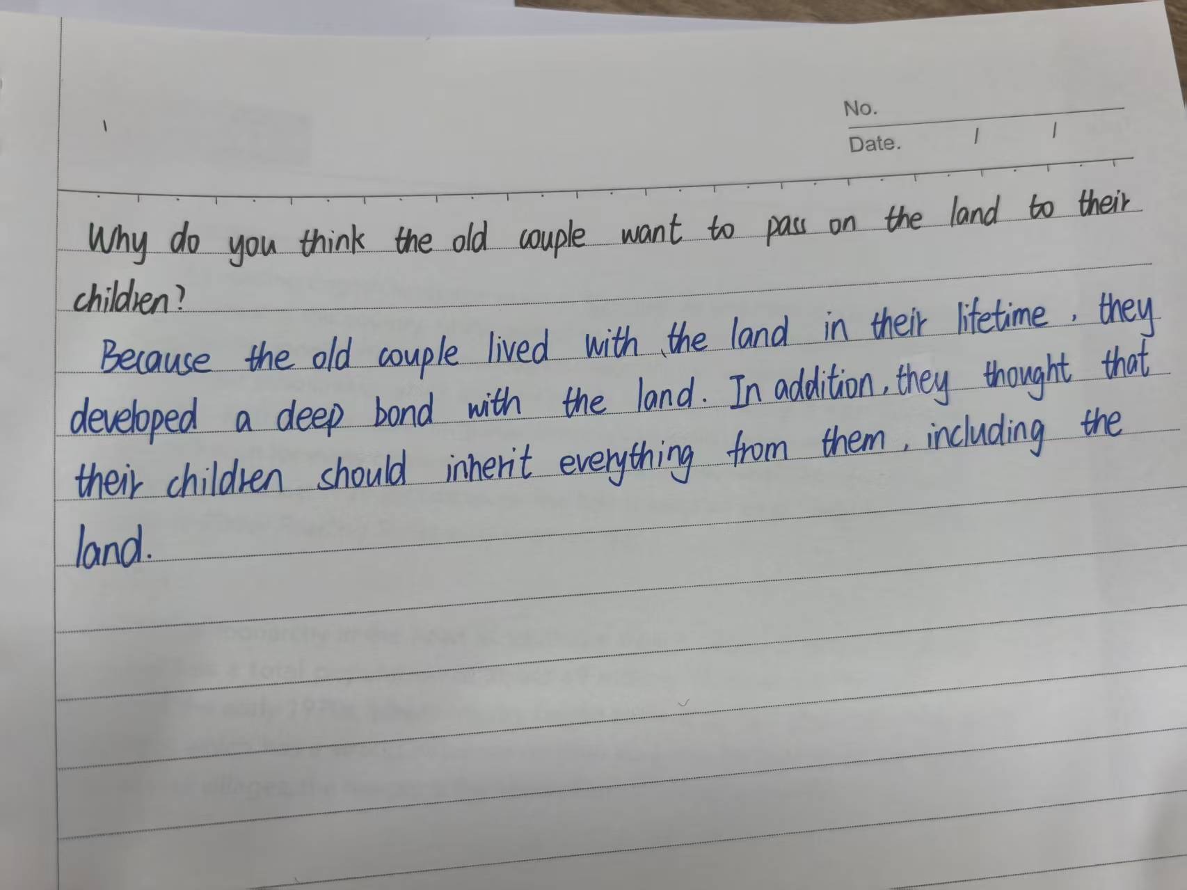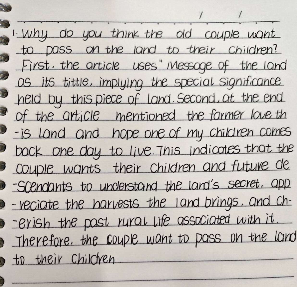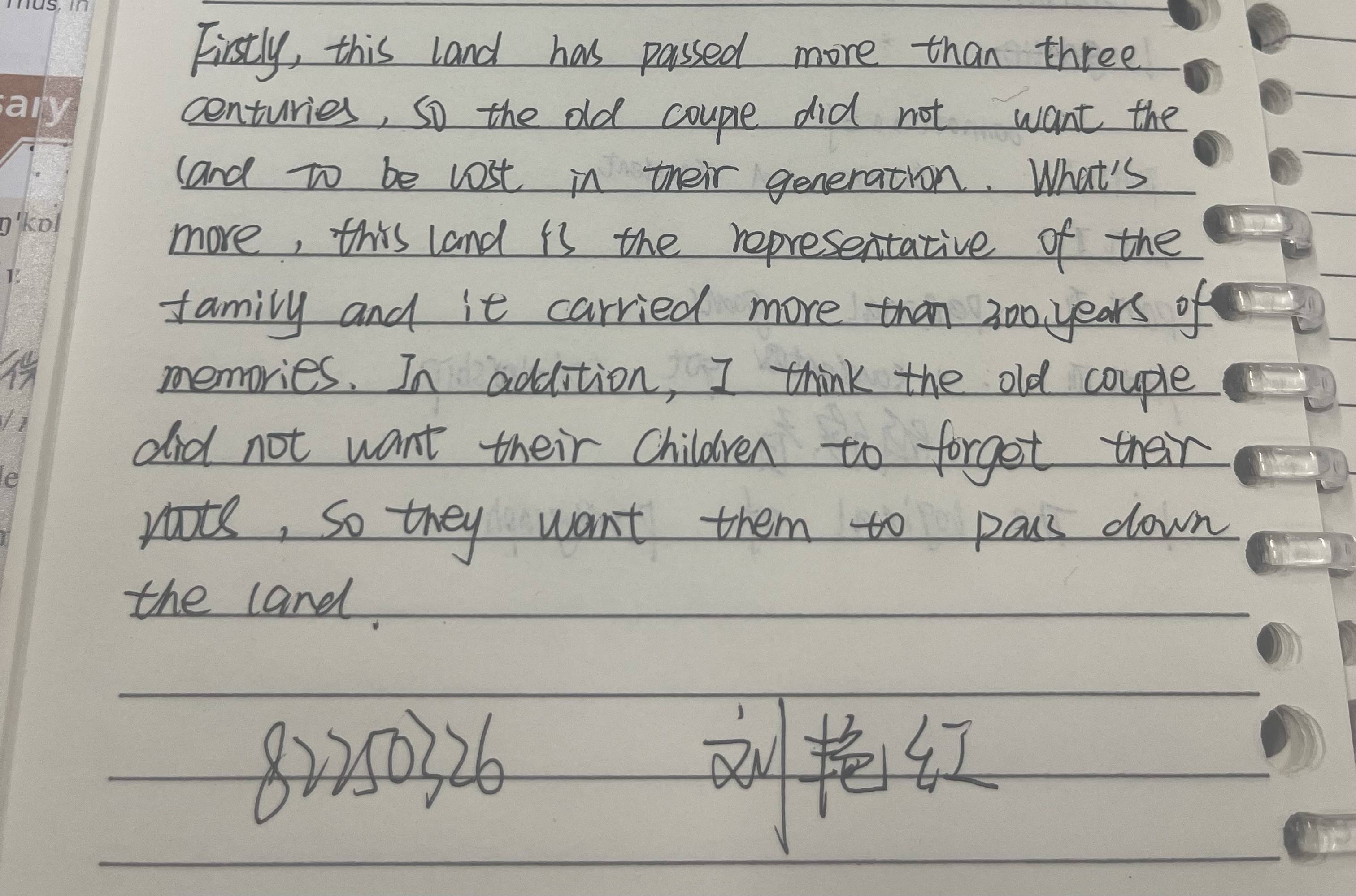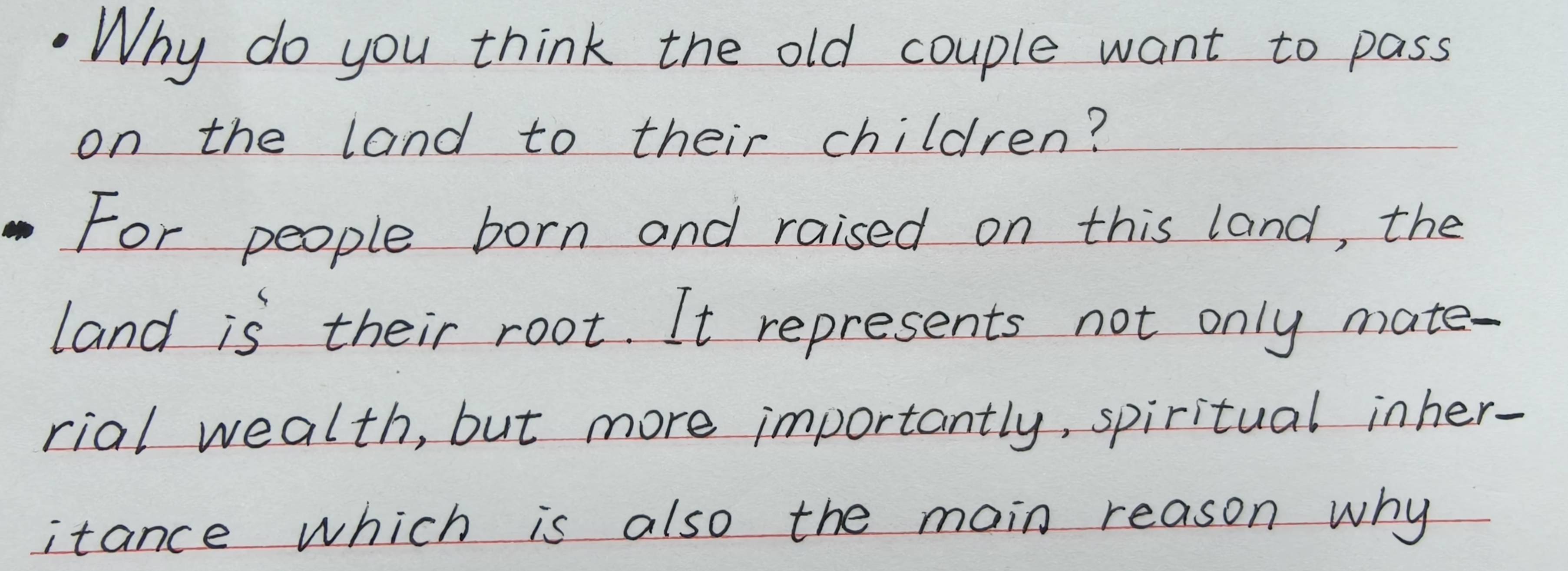 I think there are two reasons why the elderly couple want to pass the land on to their children. The first is that the couple are already very old, as the article mentioned "get old and exhausted", they are no longer capable of doing very tiring farming work and hope that their children can inherit this land. The second is that while the couple love this land, they also miss their children. "l love this land and hope one of my children comes back one day to live""it seems that none of them will ever come back to live here again."They know that their children have flown to a larger world and may not come back, but they themselves cannot leave. They can only hope that their children will come back one day and inherit the land,or pass it on to their grandchildren to ensure that this land can continue and the family roots can also be sustained.