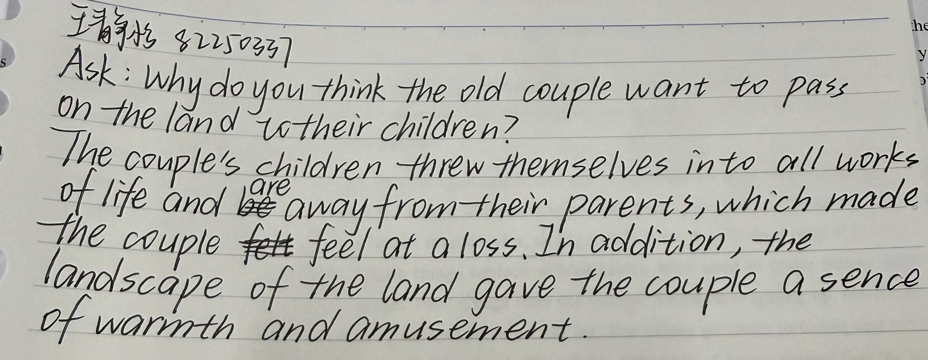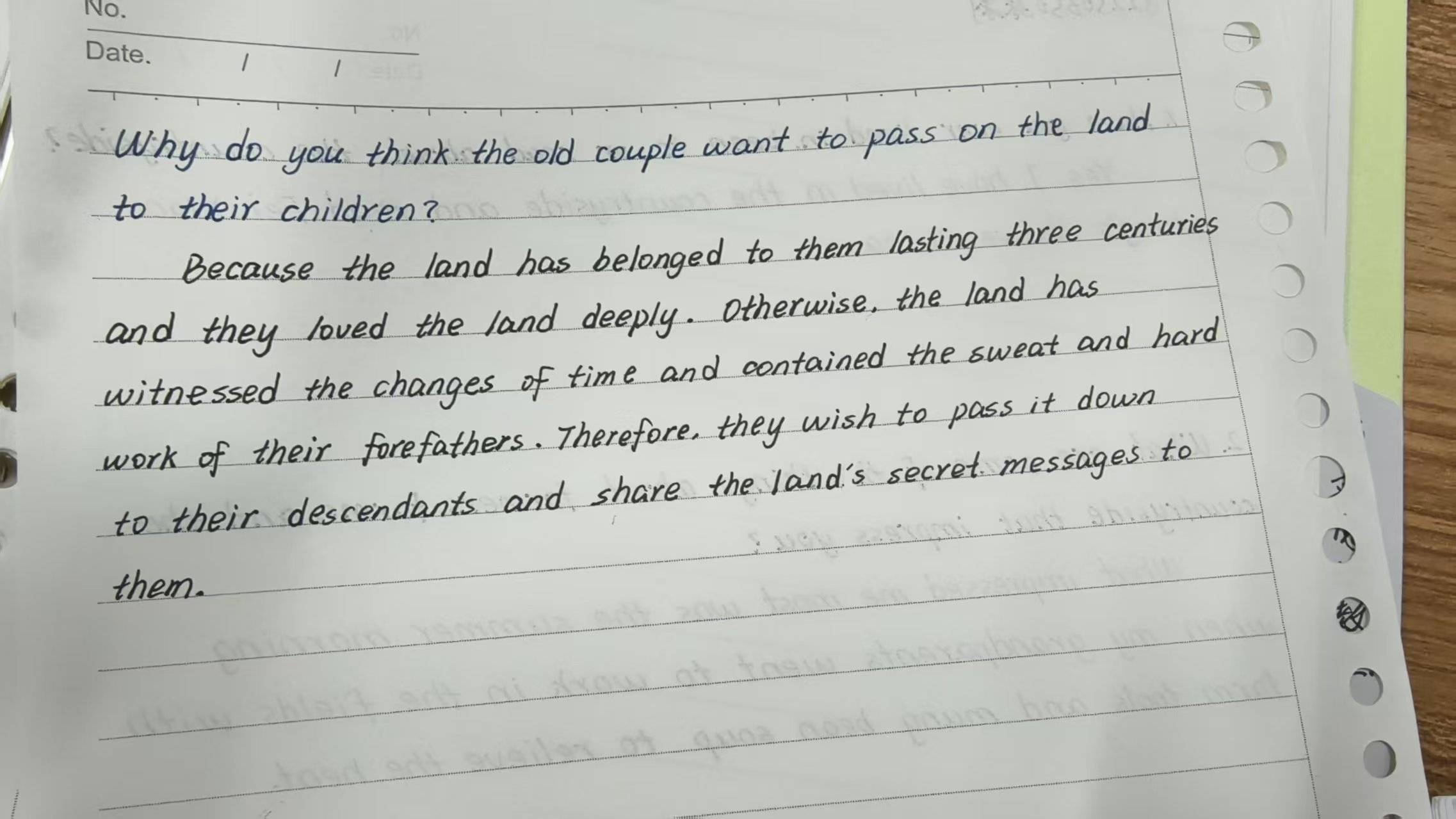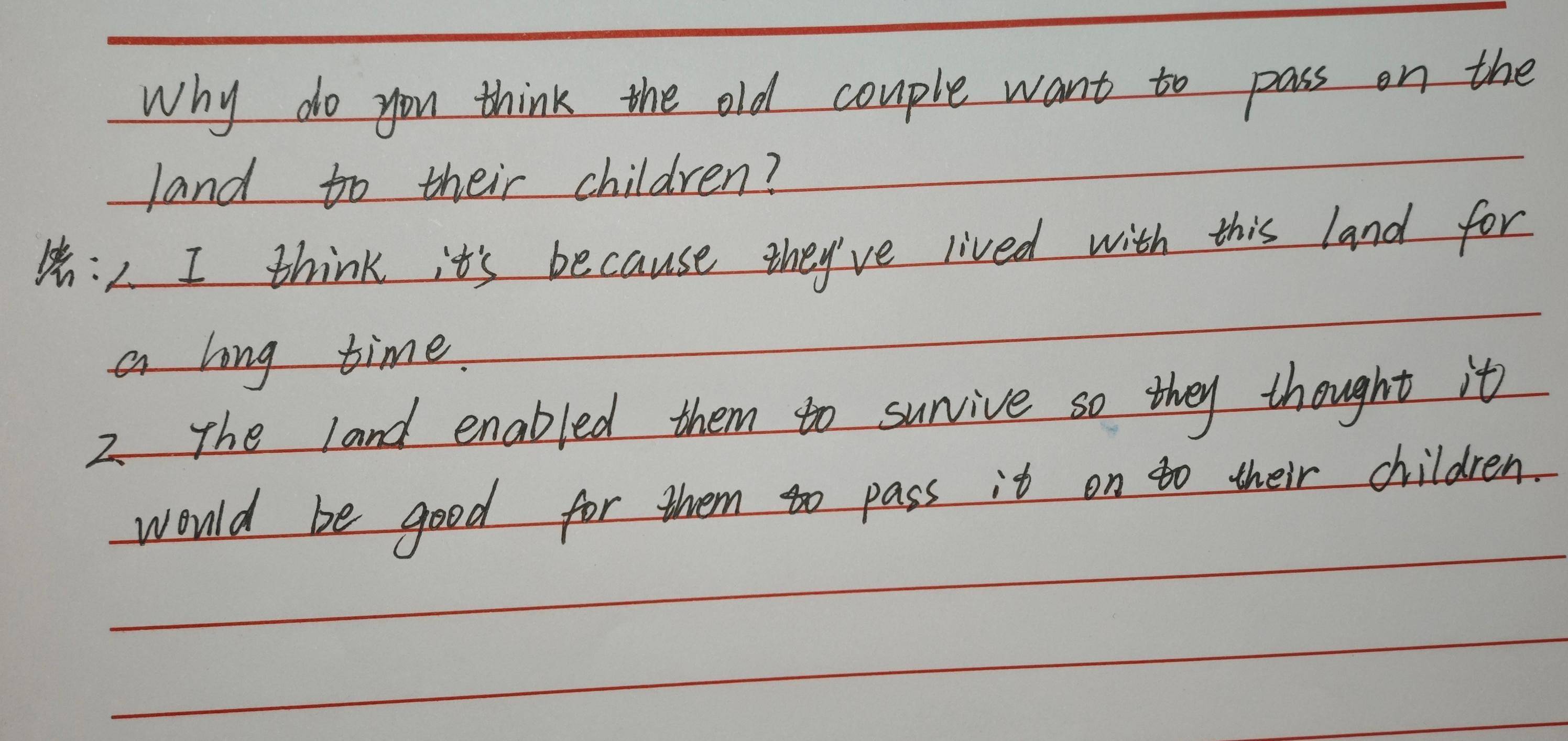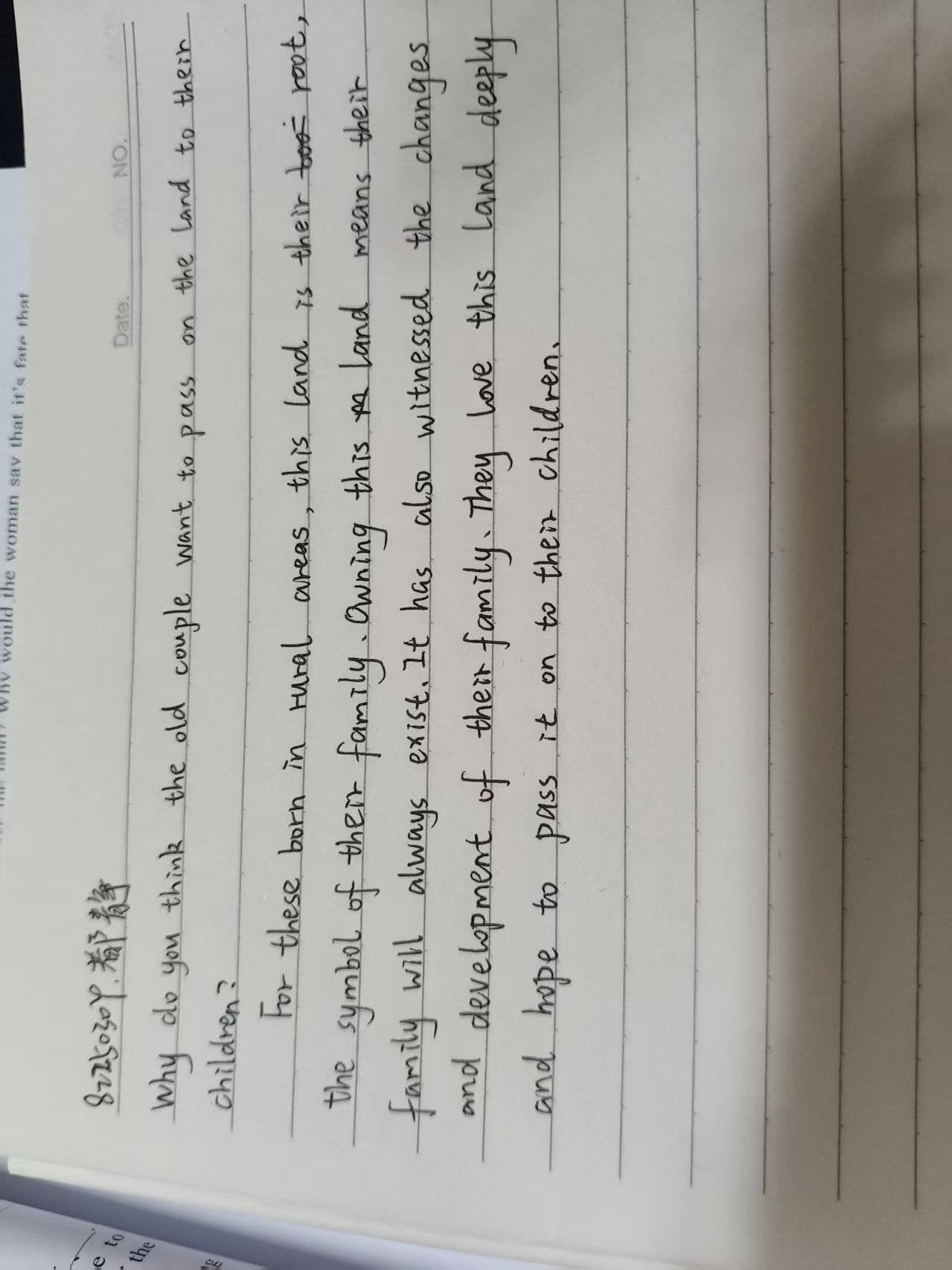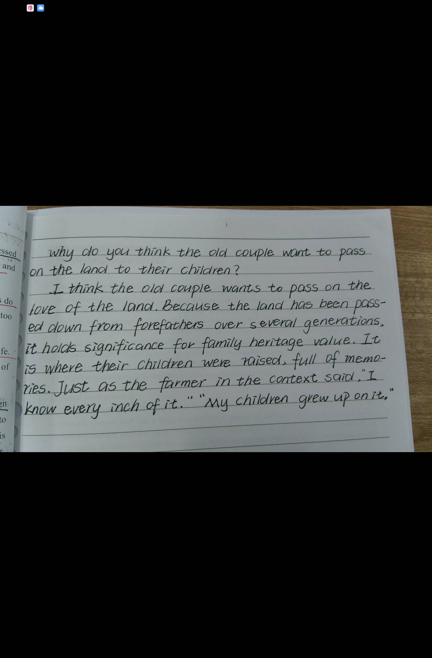 I think there are two reasons why the elderly couple want to pass the land on to their children. The first is that the couple are already very old, as the article mentioned "get old and exhausted", they are no longer capable of doing very tiring farming work and hope that their children can inherit this land. The second is that while the couple love this land, they also miss their children. "l love this land and hope one of my children comes back one day to live""it seems that none of them will ever come back to live here again."They know that their children have flown to a larger world and may not come back, but they themselves cannot leave. They can only hope that their children will come back one day and inherit the land,or pass it on to their grandchildren to ensure that this land can continue and the family roots can also be sustained.