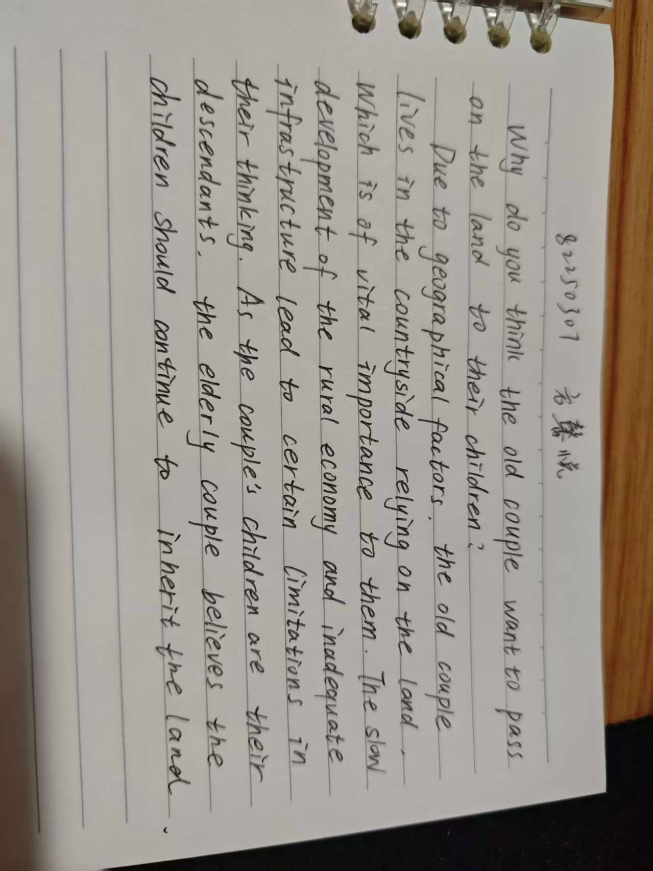 In my opinion there are three reasons why the old couple want to pass on the land to their chindren.First of all,the land represents the development of the family.It witnessed the growth of this family from generation to generation.This the old couple wanted to preserve and protect the piece of land which implies the history and heritage of the family.Second,the old couple without children by their side was lonely.If they can pass on the land to their chindren,it means thier children can come back and company them.Third,such an idea is a manifestation of the love for the land by the older generation,and also a protection of traditional culture.