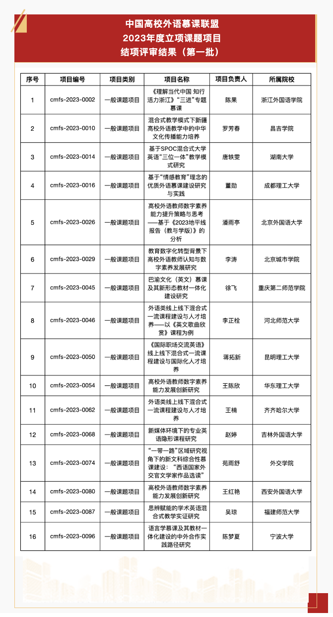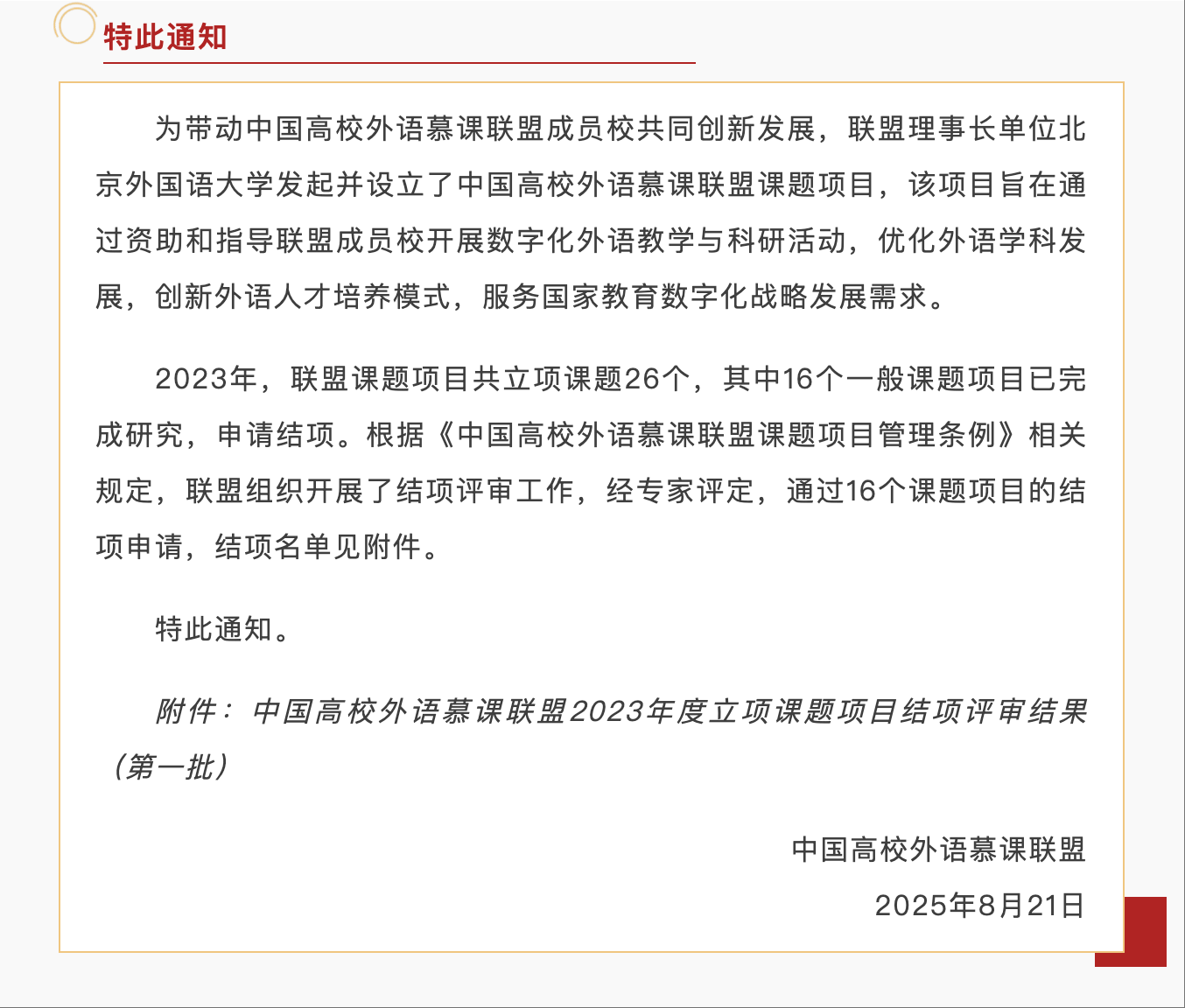 中国高校外语慕课联盟2023年度课题项目结项结果通知